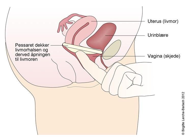 - Pessaret plasseres i skjeden slik at ringen ligger tett an mot skjedeveggen. Seglet vil da blokkere forbindelsen videre oppover i skjeden mot livmorhalsen og livmorhulen