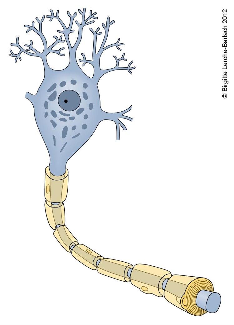 Umodne nerveceller starter sin vandring fra innsiden av nevralrøret og går utover for å danne motoriske aksoner (forbindelser) til muskulatur og sensoriske aksoner (følenerver) til sanseorganer. Der modnes de og deres cellekjerner utgjør den grå substansen i hjernen. Kjernenes aksoner til andre nerveceller utgjør den hvite substansen. Det isolerende fettlaget, myelin, gir aksonene hvit farge og gjør overføringen av nervesignaler raskere. Denne prosessen, som kalles myelinisering, begynner i fjerde fostermåned og avsluttes ikke før to til tre år etter fødselen.