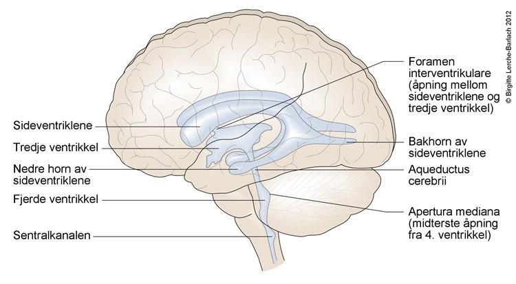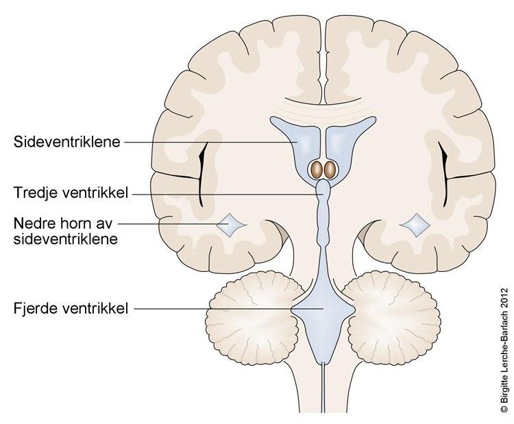 Inne i hjernen er det fire hulrom (ventrikler) som er forbundet med hverandre, og som er fylt med væske, cerebrospinalvæsken (se nedenfor). Ventriklene har åpen forbindelse med det lange, tynne hulrommet som går nedover i ryggkanalen og med hulrommet mellom det bløte hjernevevet og kraniet (se nedenfor). Alle disse hulrommene inneholder cerebrospinalvæske.