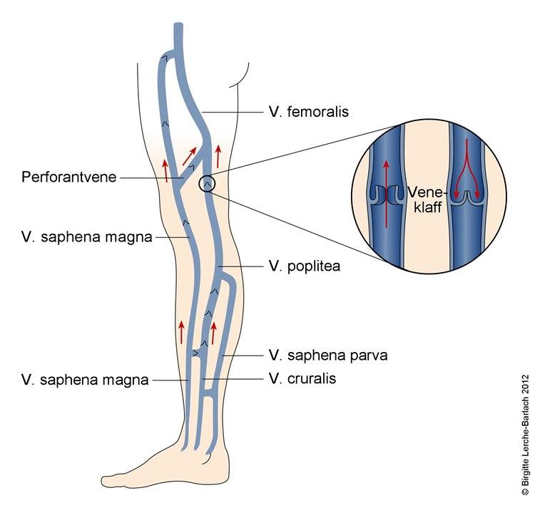 Når en vene tettes igjen, øker trykket inne i venen. Venene inneholder klaffer som fungerer som ventiler som gjør at blodet bare kan strømme en vei gjennom blodåren, nemlig mot hjertet. Med økt trykk kan disse klaffene bli ødelagt. Det gjør at venene ikke leder blodet like effektivt som før, og blodet "hoper seg opp" i bena. Dette kan medføre at væske siver ut av blodåren og lager hevelse og fargeforandringer i huden.