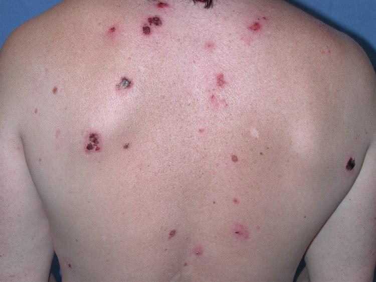 Tilstanden er så overflatisk at det finnes ikke overliggende vev som kan danne blemmer. Utslettene begynner med en rekke kløende, skorpedannende, myntstore flekker på øvre del av kroppen, ansiktet og skalpen.