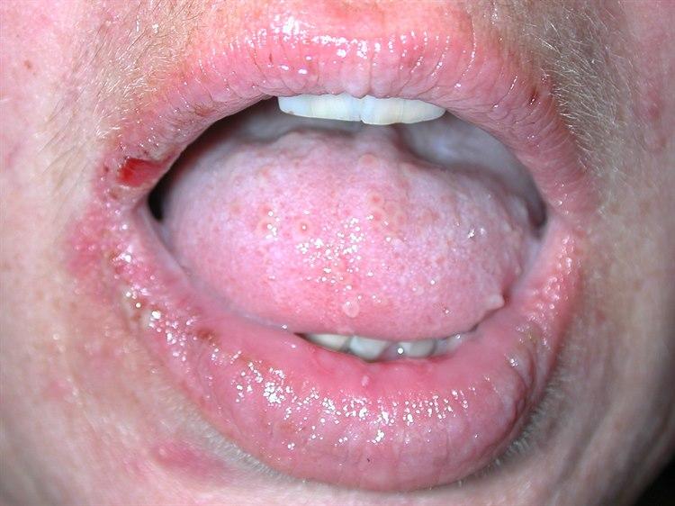 Tilstanden starter i de fleste tilfeller med smertefulle sår i munnen som ikke gror. Blemmer er sjeldne siden de sprekker kort tid etter at de er dannet og etterlater seg et sår. Det er vanligvis mange sår, de er overflatiske og uregelmessige i form og oppstår fra en tilsynelatende frisk slimhinne. Sårene gror ikke, i motsetning til mer uskyldige munnsår.