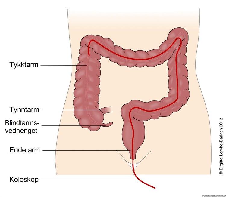 Før undersøkelsen gis det som regel et avslappende middel intravenøst. Undersøkelsen starter med at legen undersøker endetarmen din med en finger. Deretter føres et godt smurt koloskop inn gjennom endetarmen og oppover i tarmen som er ca. 1 meter lang. Du ligger da vanligvis på venstre side. Luft blåses inn i tarmen gjennom skopet for å utvide tarmen og bedre oversikten. Ofte må en medhjelper trykke på magen din for å lette fremføringen av endoskopet. Endoskopøren får som regel best oversikt når skopet trekkes ut, derfor gjøres den mer nitidige granskningen da. Undersøkelsen kan føles ubehagelig, med luft- og knipsmerter. Forbigående luftplager oppleves også etter undersøkelsen. Hele undersøkelsen med eventuelle prøvetakninger tar omtrent ½ - 1 time.