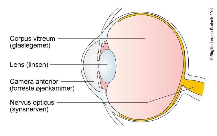 Øyet består ytterst av senehinnen, sklera, som er det hvite vi ser rundt pupillen. Fortil er senehinnen erstattet av hornhinnen, kornea, som er et glassklart vindu inn til øyets indre. På innsiden av hornhinnen er det et væskefylt rom, fremre kammer. Bakenfor dette finner vi regnbuehinnen (iris) som ligger som en krans rundt pupillen.