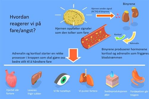 Angsten er en naturlig del av oss, og den er knyttet til visse automatiske kroppslige reaksjonsmønster. Den mest kjente av disse er kanskje sloss, røm eller stå helt stille -responsen ("fight, flight or freeze") som er våre automatiske reaksjoner ved fare. Står vi ovenfor fare blir vi som regel enten sint/aggresiv eller redd (stivner eller flykter). Andre kjente normale kroppslige reaksjonsmønstre er besvimelse når man ser blod, latter ved glede og endret adferd ved forelskelse.