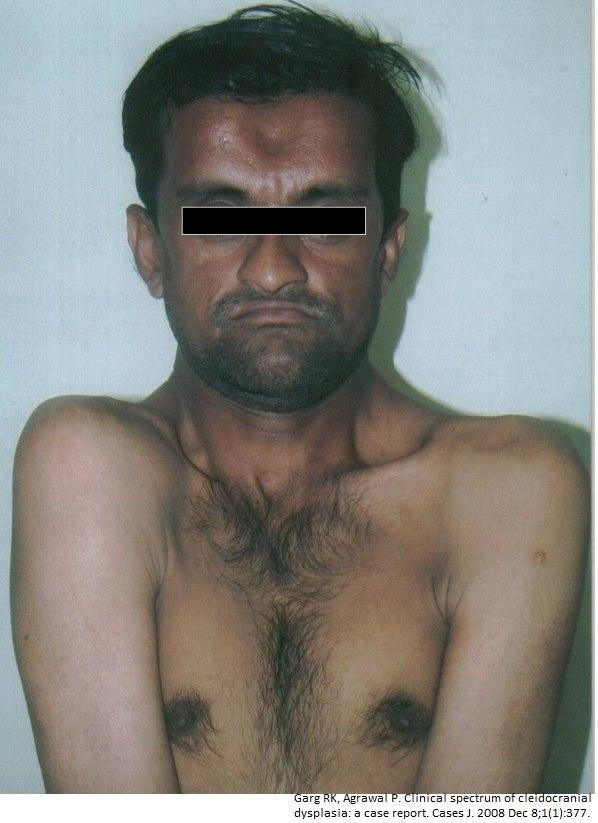 - Manglende eller underutviklede kragebein (cleido = kragebein), forsinket lukning av hodeskallesømmene (cranial = hodeskalle), og endret tannutvikling er typisk