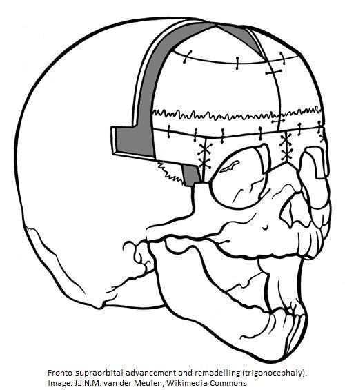 Hodet får en trekantfasong (trigonocephali). Øynene sitter tettere enn vanlig. Høytsittende øyenbryn kan gi et typisk, overrasket ansiktsuttrykk.